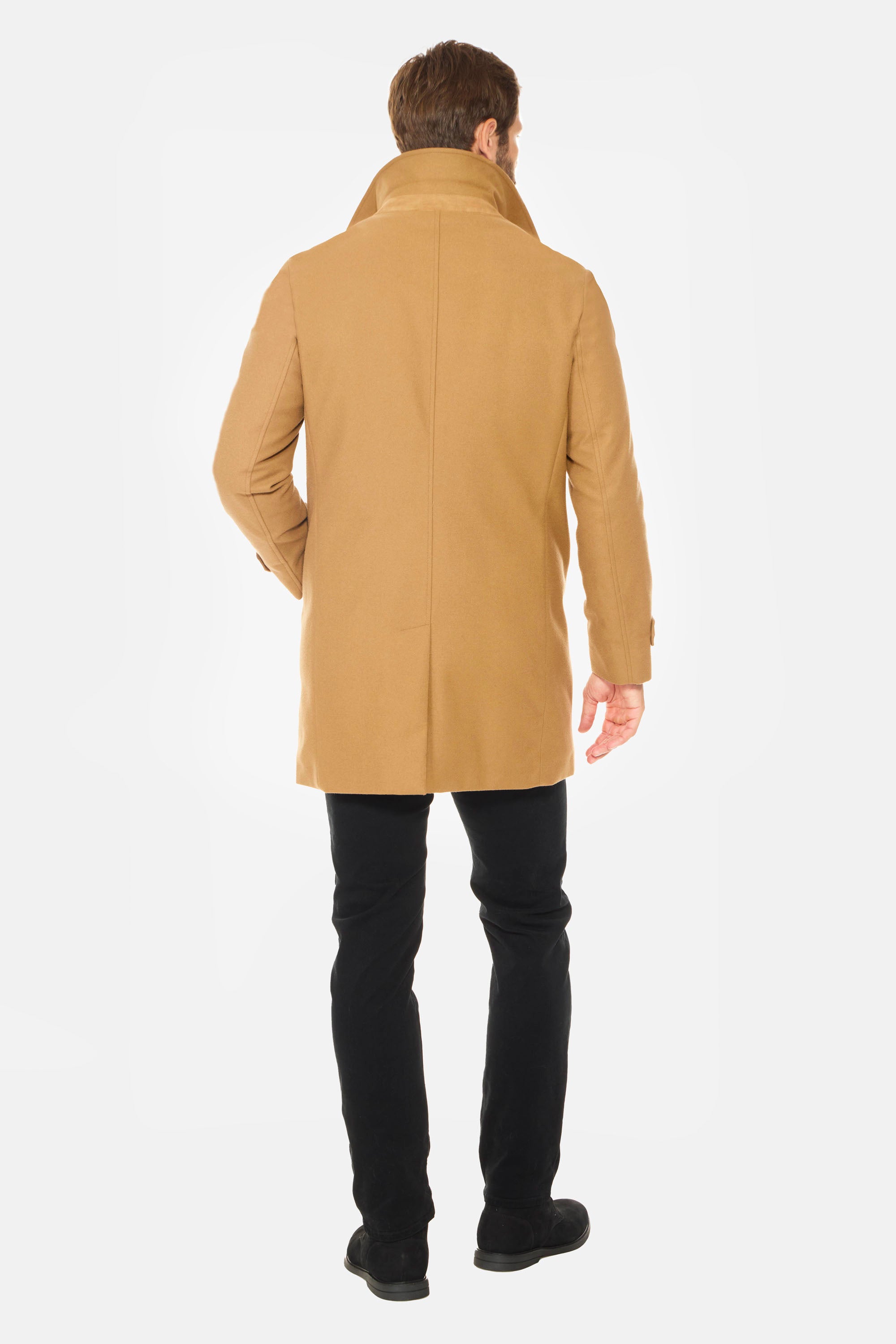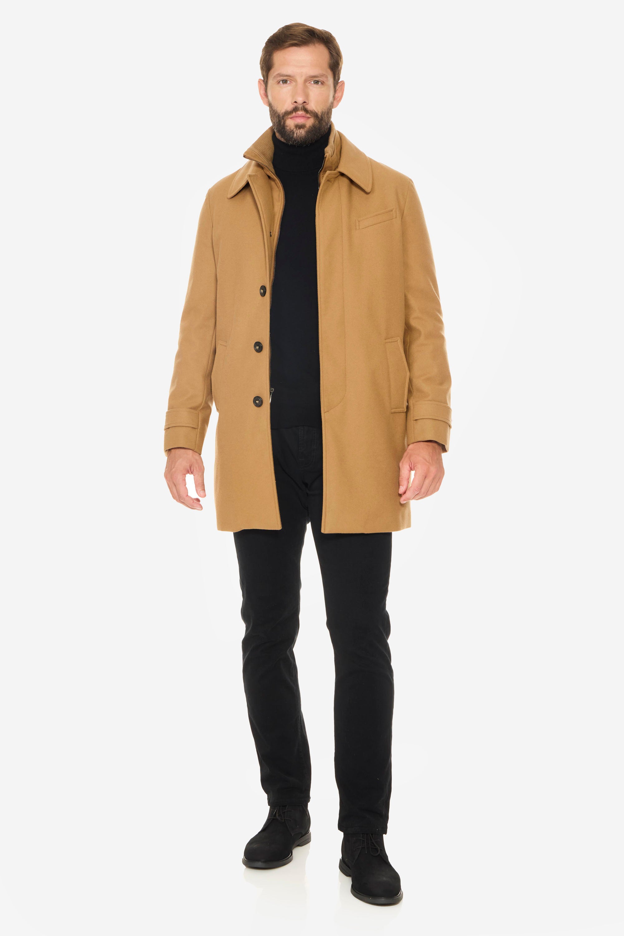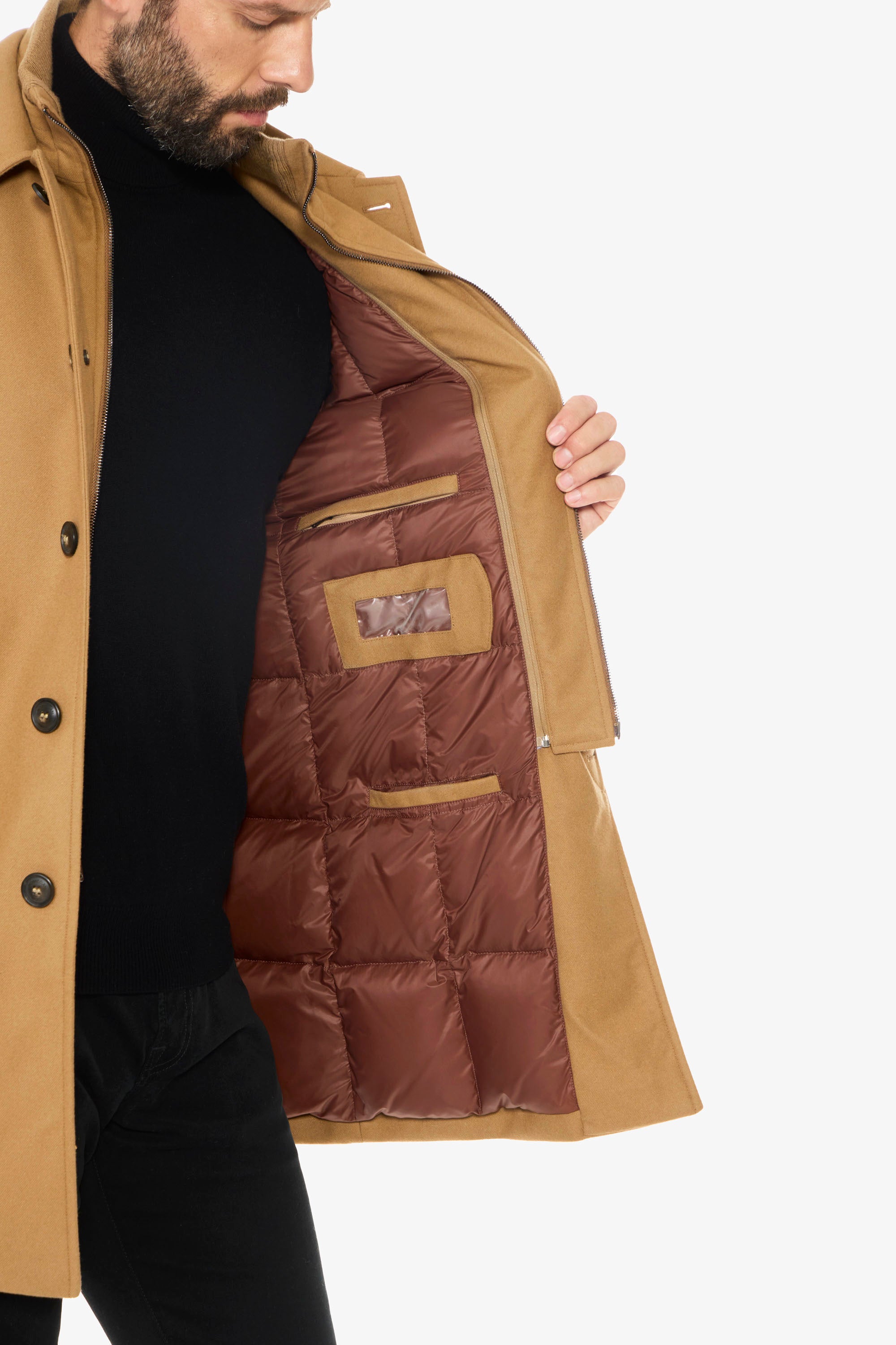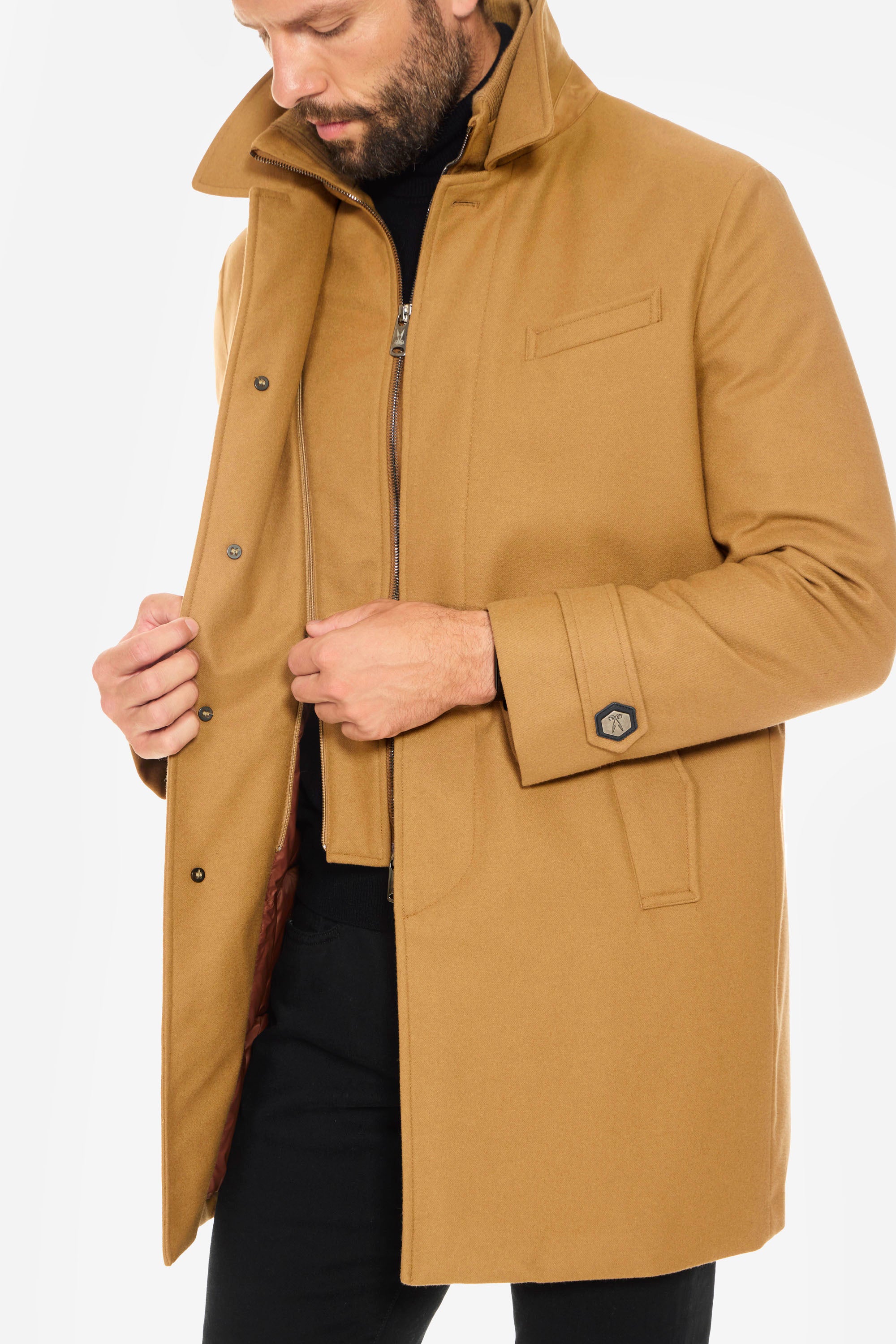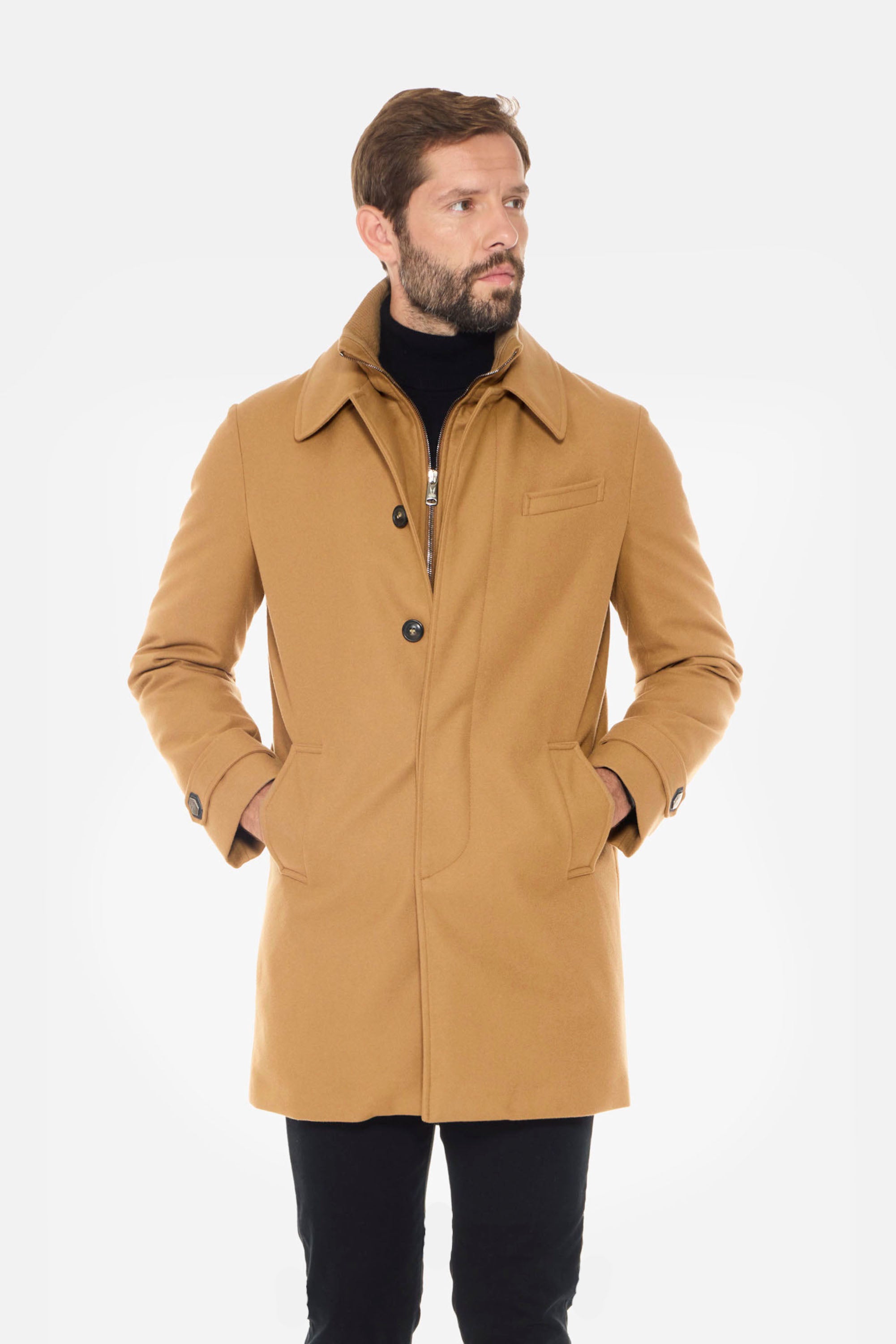 Mid length commuter overcoat with removable winter chest bib. Designed to be very light-on-the-body but ultra warm and with high performance protection. Features a sharp, timeless, silhouette packed inside of a luxury, waterproof, insulated coat. Can be worn as formal topcoat or worn casually. Â A warm camel wool coat with added performance.Â