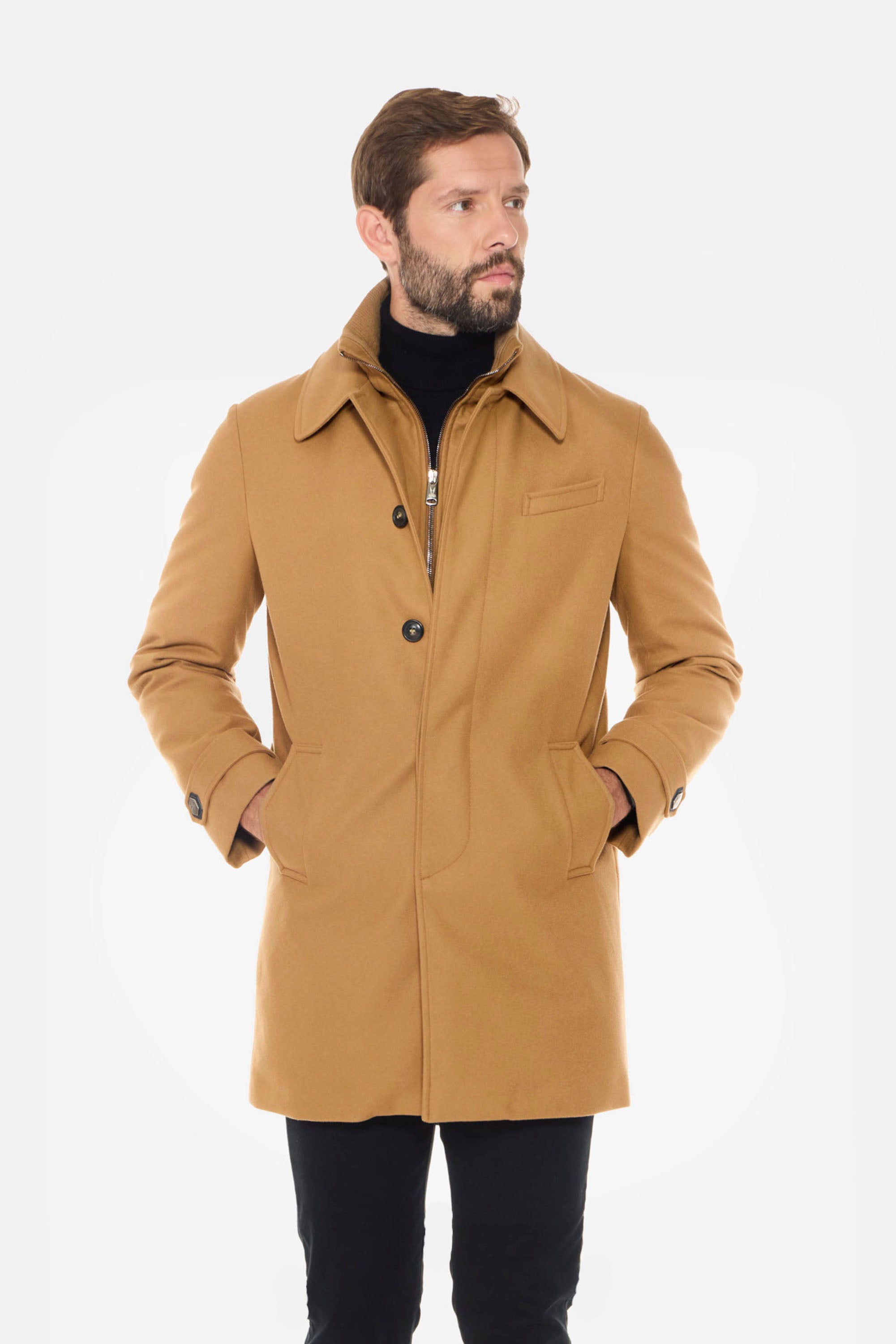 Mid length commuter overcoat with removable winter chest bib. Designed to be very light-on-the-body but ultra warm and with high performance protection. Features a sharp, timeless, silhouette packed inside of a luxury, waterproof, insulated coat. Can be worn as formal topcoat or worn casually. A warm camel wool coat with added performance.